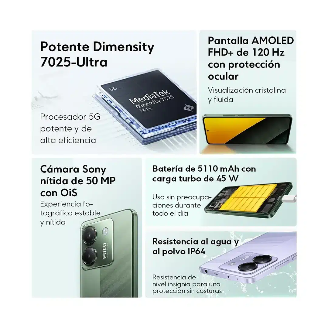Descubre el POCO M7 Pro 5G, un smartphone de gama media con prestaciones premium. Su pantalla AMOLED de 6,67″ FHD+ y 120 Hz de refresco garantiza una experiencia visual nítida y fluida, destacando también por un brillo de hasta 2100 nits y protección Gorilla Glass 5.